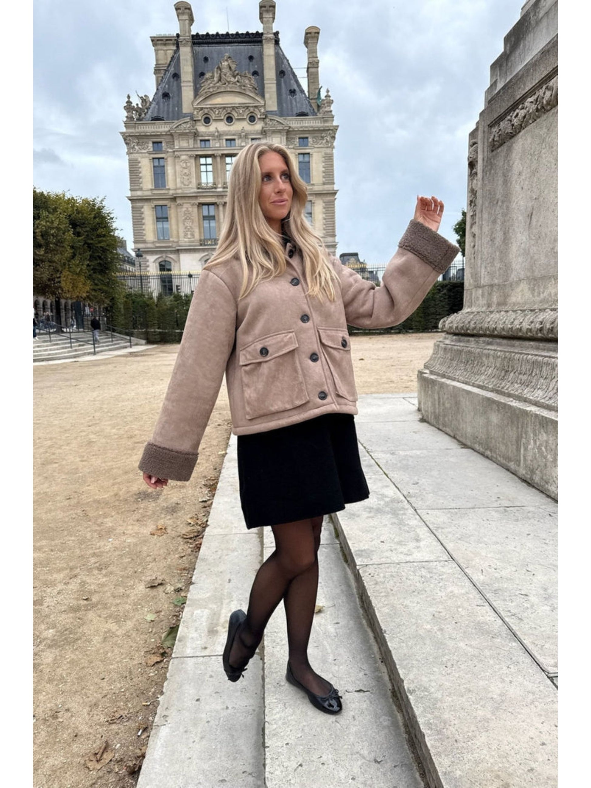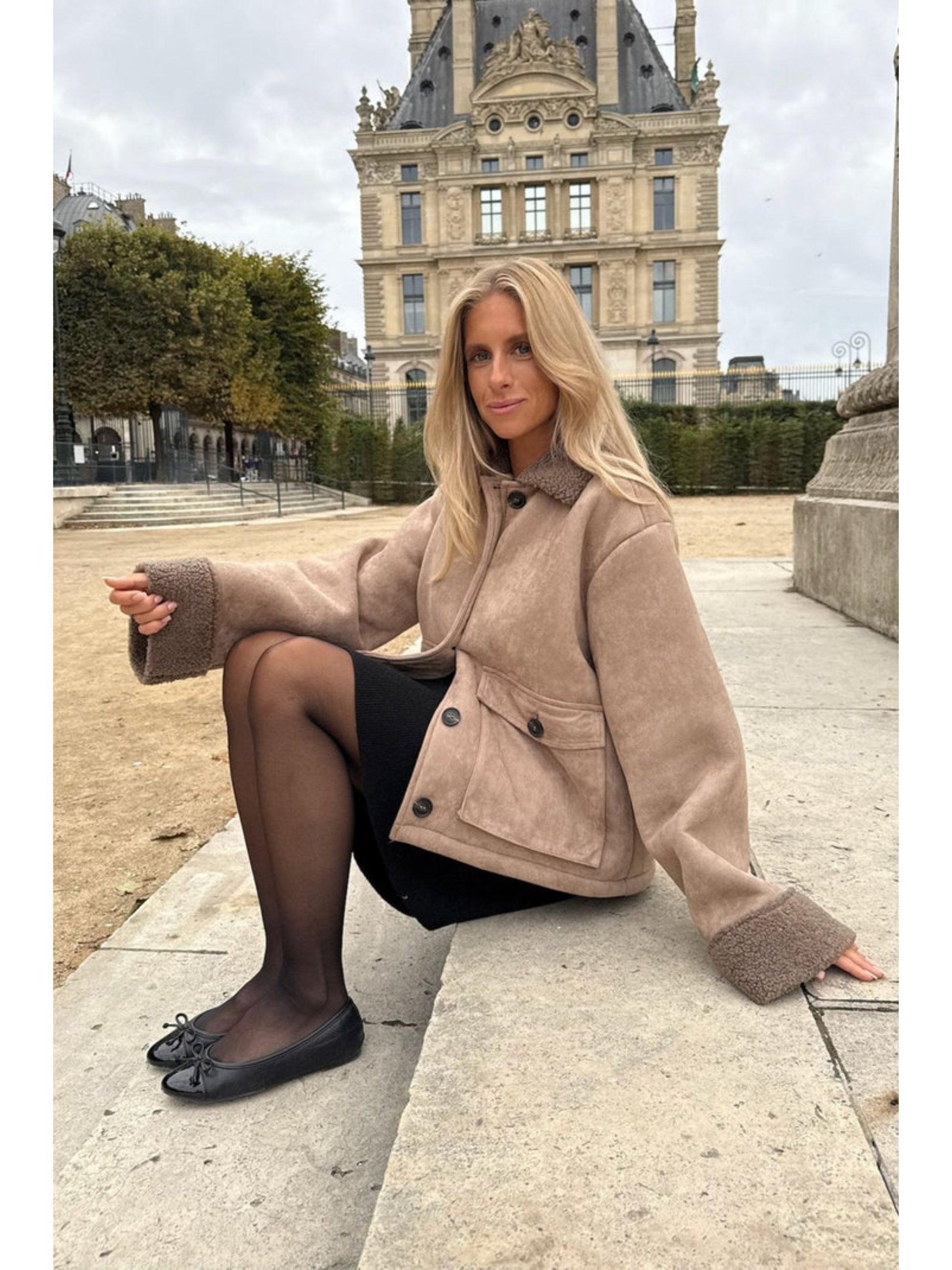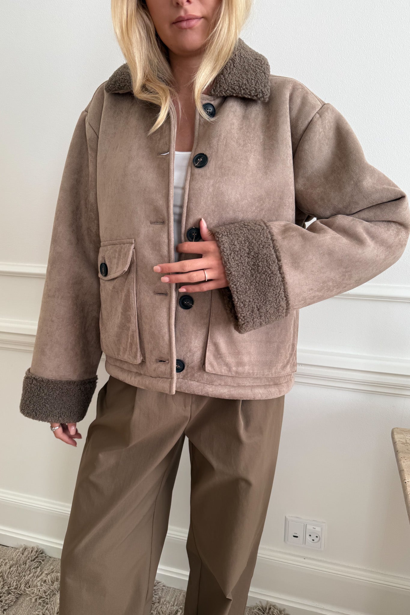 Innsiden er fôret med myk teddy som gjør jakken varm og behagelig å bruke på kjølige dager. Den lukkes med dekorative knapper foran og har en stilren krage som gir et tidløst uttrykk.