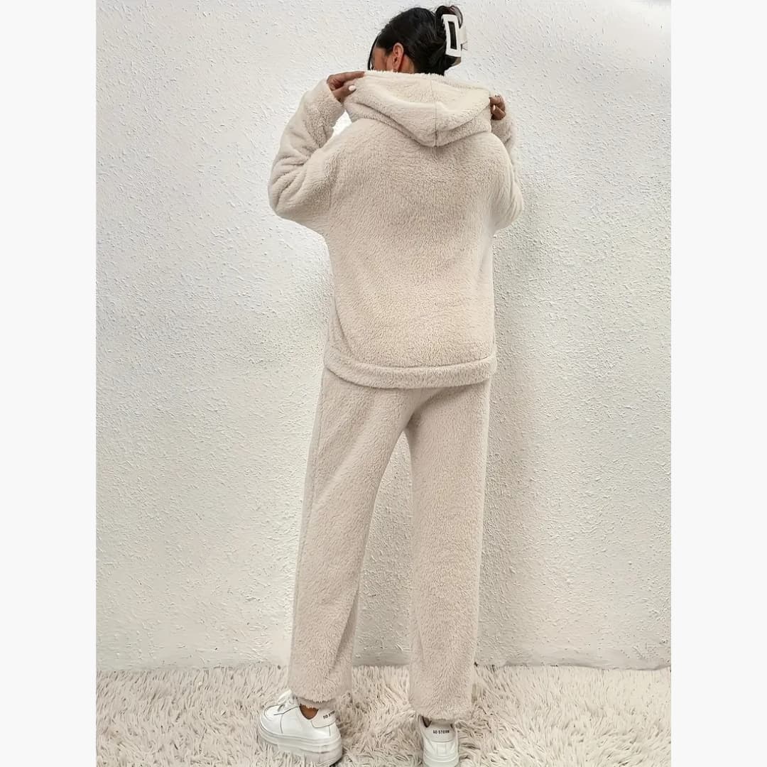 Dette myke og koselige 2-delte lounge-damesettet er designet for maksimal komfort på kjølige dager. Settet består av en avslappet topp og matchende bukse med behagelig passform, perfekt for avslapning hjemme eller rolige dager ute.